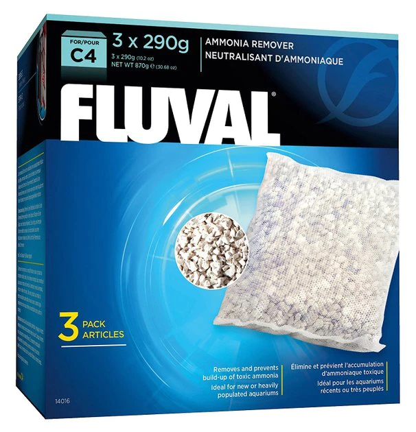 Keep your aquarium free of harmful ammonia and your multi-stage mechanical filtration operating effectively with Fluval C4 Ammonia Remover Filter Media. Fish waste, uneaten food and other refuse can cause ammonia to build up in your aquarium which can cause stress, illness and even death. Fluval C4 Ammonia Remover Filter Media immediately removes and controls ammonia and nitrite, improving your water quality and reducing stress on your fish. It is ideal for new or heavily populated freshwater aquariums.