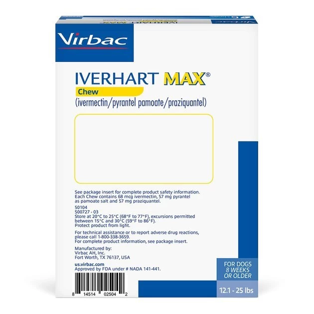 For use in animals only. Your furry friend must have a current heartworm test result on file with your veterinarian in order to be prescribed heartworm medication. Please visit your veterinarian to have this test performed annually to protect your four-legged friend. Help protect your pet from pesky pests with Iverhart Max Chews. These soft chews are formulated to help prevent heartworm disease and can also help treat and control the other three most common worms—roundworms, hookworms and tapeworms. This broad-spectrum medication helps to provide safe and effective year-round protection when given monthly and is intended for dogs 8 weeks or older weighing 12.1 to 25 pounds. To top it all off, it has a drool-worthy bacon flavor that your dog will love.