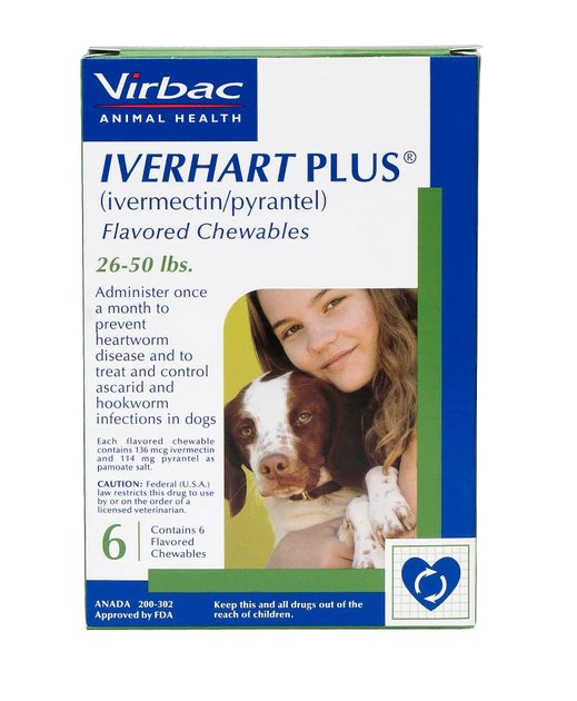 For use in animals only. Your furry friend must have a current heartworm test result on file with your veterinarian in order to be prescribed heartworm medication. Please visit your veterinarian to have this test performed annually to protect your four-legged friend. Iverhart Plus Chewable Tablets are prescribed to help protect your pet from heartworm disease, which can cause tiredness, decreased appetite and, eventually, heart failure in dogs. These easy-to-feed tablets may also help control two common intestinal parasites, roundworms and hookworms. Iverhart Plus chewables help provide safe and effective protection each month, and come in a pork liver-flavored chewable—so they’re easy to give to your dog as a tasty treat.