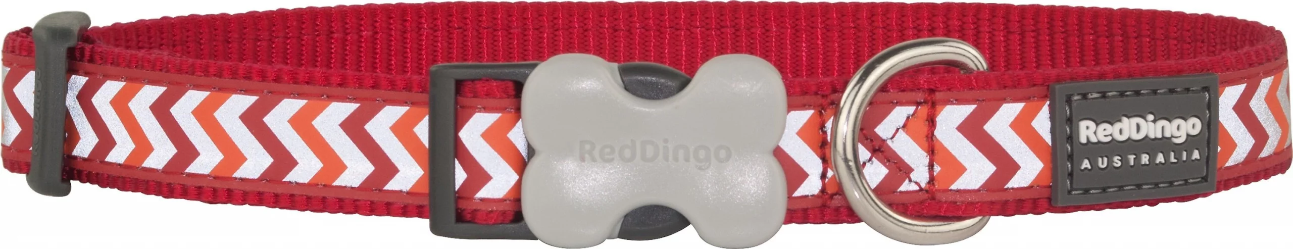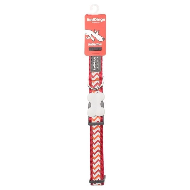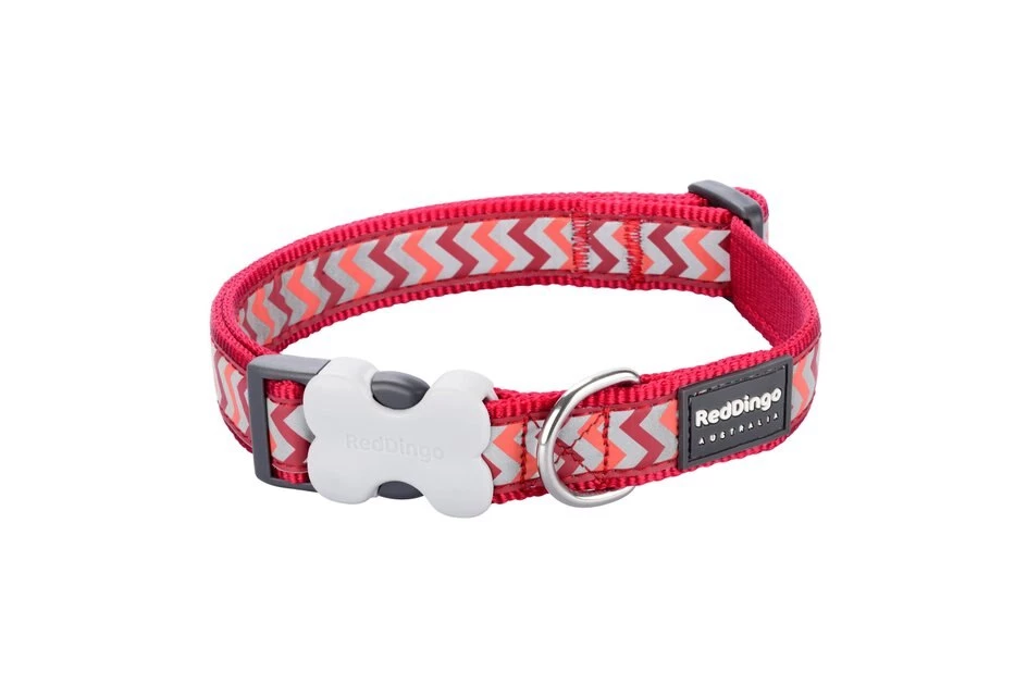 Keep your furry best friend safe in even the lowest of light with the uniquely stylish Red Dingo Reflective Ziggy Dog Collar. With a fun and fashionable zig-zag pattern made with a special reflective material designed to keep your pooch visible at night or in the rain, this collar comes in a wide range of eye-catching colors that will have her walking pretty and staying secure. Made from premium nylon webbing with securely sewn seams, this soft and abrasion-resistant collar will provide your pup with the ultimate in long-lasting comfortable safety and style. And the trademarked “Bucklebone” side-release clip and stainless steel D-ring leash attachment ensure that you can get the collar on and off easily, while also making sure that your pup stays securely attached on your neighborhood strolls.