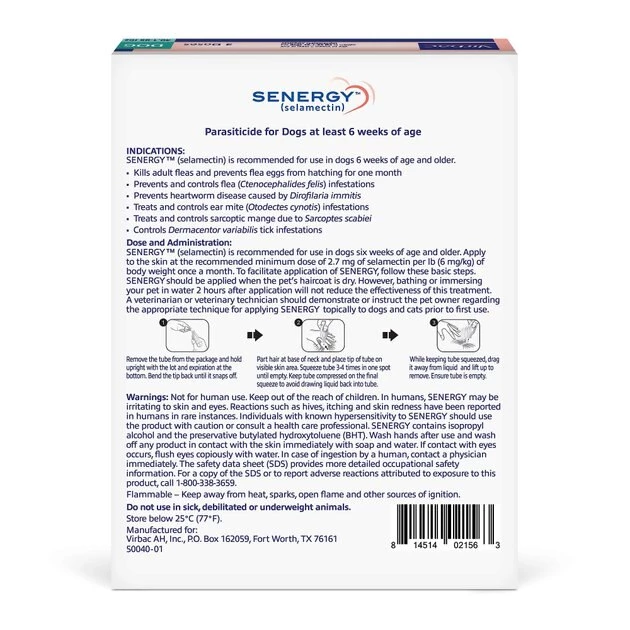 WARNINGS: Not for human use. Keep out of the reach of children. In humans, SENERGY may be irritating to skin and eyes. Reactions such as hives, itching and skin redness have been reported in humans in rare instances. Individuals with known hypersensitivity to SENERGY should use the product with caution or consult a health care professional. SENERGY contains isopropyl alcohol and the preservative butylated hydroxytoluene (BHT). Wash hands after use and wash off any product in contact with the skin immediately with soap and water. If contact with eyes occurs, then flush eyes copiously with water. In case of ingestion by a human, contact a physician immediately. The safety data sheet (SDS) provides more detailed occupational safety information. To report suspected adverse drug events, for technical assistance or to obtain a copy of the SDS, contact Virbac AH, Inc. at 1-800-338-3659 or us.virbac.com. For additional information about adverse drug experience reporting for animal drugs, contact FDA at 1-888-FDA-VETS or http://www.fda.gov/reportanimalae. Flammable – Keep away from heat, sparks, open flames or other sources of ignition. Do not use in sick, debilitated or underweight animals (see SAFETY). PRECAUTIONS: Prior to administration of SENERGY, dogs should be tested for existing heartworm infections. At the discretion of the veterinarian, infected dogs should be treated to remove adult heartworms. Selamectin is not effective against adult D. immitis and, while the number of circulating microfilariae may decrease following treatment, selamectin is not effective for microfilariae clearance. Hypersensitivity reactions have not been observed in dogs with patent heartworm infections administered three times the recommended dose of selamectin. Higher doses were not tested.