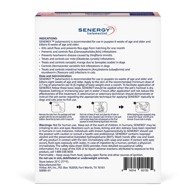 WARNINGS: Not for human use. Keep out of the reach of children. In humans, SENERGY may be irritating to skin and eyes. Reactions such as hives, itching and skin redness have been reported in humans in rare instances. Individuals with known hypersensitivity to SENERGY should use the product with caution or consult a health care professional. SENERGY contains isopropyl alcohol and the preservative butylated hydroxytoluene (BHT). Wash hands after use and wash off any product in contact with the skin immediately with soap and water. If contact with eyes occurs, then flush eyes copiously with water. In case of ingestion by a human, contact a physician immediately. The safety data sheet (SDS) provides more detailed occupational safety information. To report suspected adverse drug events, for technical assistance or to obtain a copy of the SDS, contact Virbac AH, Inc. at 1-800-338-3659 or us.virbac.com. For additional information about adverse drug experience reporting for animal drugs, contact FDA at 1-888-FDA-VETS or http://www.fda.gov/reportanimalae. Flammable – Keep away from heat, sparks, open flames or other sources of ignition. Do not use in sick, debilitated or underweight animals (see SAFETY). PRECAUTIONS: Prior to administration of SENERGY, dogs should be tested for existing heartworm infections. At the discretion of the veterinarian, infected dogs should be treated to remove adult heartworms. Selamectin is not effective against adult D. immitis and, while the number of circulating microfilariae may decrease following treatment, selamectin is not effective for microfilariae clearance. Hypersensitivity reactions have not been observed in dogs with patent heartworm infections administered three times the recommended dose of selamectin. Higher doses were not tested.