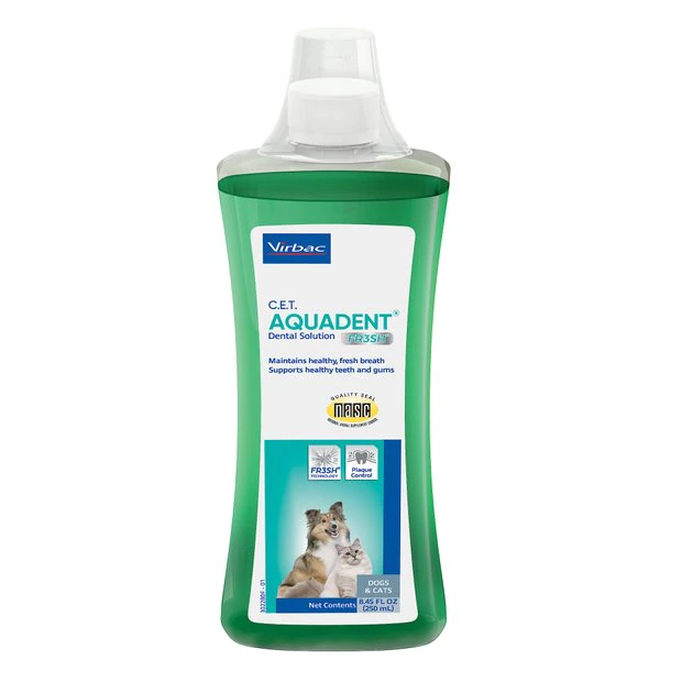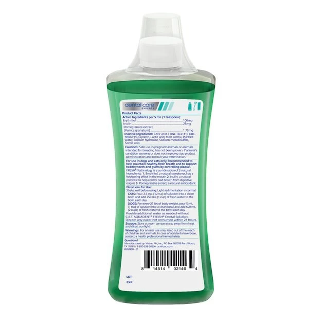Help keep your furry friend’s breath fur-esh and her teeth in tip-top condition with Virbac C.E.T Aquadent Dog & Cat Dental Solution. This formula is made in the USA with FR3SH Technology, which uses three natural ingredients—erythritol, pomegranate and inulin. Erythritol is a natural sweetener that delivers a fresh mouth feel, pomegranate is a natural antioxidant that helps combat plaque and bacteria and inulin is a natural prebiotic that helps control the growth of bacteria helping to fight bad breath. This dental solution not only promotes fresh breath, but it also helps keep teeth and gums healthy, too!