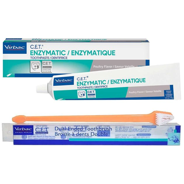 - Comes with a 70-gram tube of Virbac C.E.T. Enzymatic Dog & Cat Poultry Flavor Toothpaste and a Virbac C.E.T. Dual Ended Dog & Cat Toothbrush of a various color.