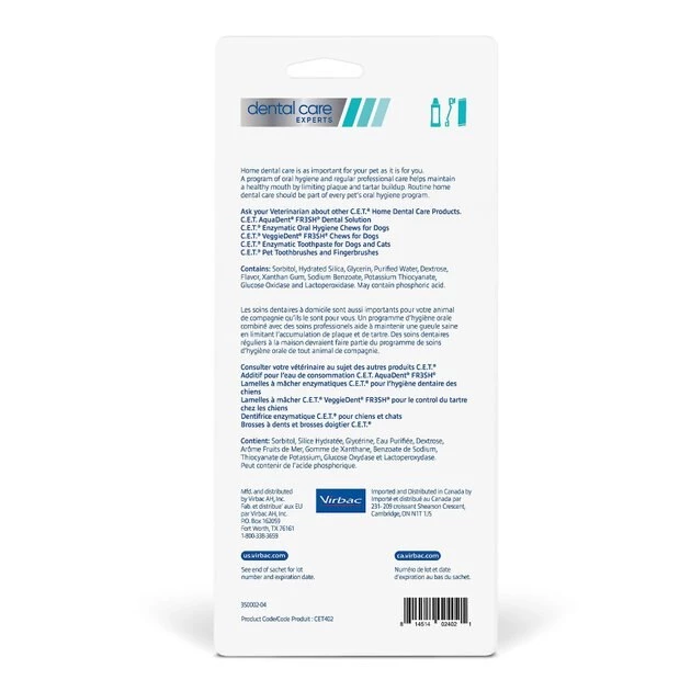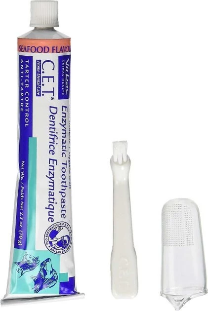 C.E.T. Cat Toothbrush is designed especially for feline mouths, which have very little room between their back teeth and cheeks. This toothbrush has long, soft bristles shaped into a pointed tuft. By placing just the tuft of the bristles between the cheek and the teeth, the back teeth can be brushed without causing discomfort. Great tasting seafood-flavored C.E.T. Tartar Control Toothpaste is ideal for cats that quickly build up plaque and tartar.