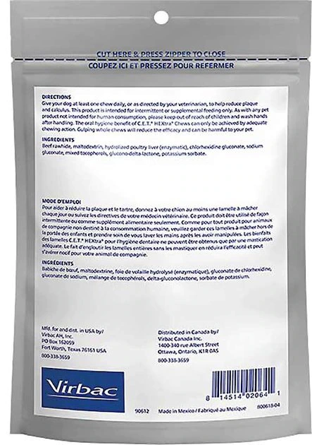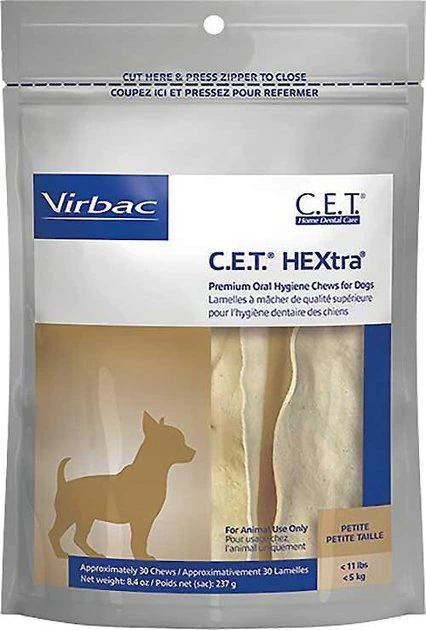 With 25 years of leadership in veterinary home dental care, C.E.T. products are the most tenured veterinary brands in the market today. The Virbac C.E.T. product line can give you peace of mind because it’s recommended by veterinary professionals. With a patented chlorhexidine system that helps remove plaque and reduce tartar, Virbac C.E.T. HEXtra Premium Dental chews will give your pooch a one-of-a kind clean! These paw-ticular treats are designed for petite pups.