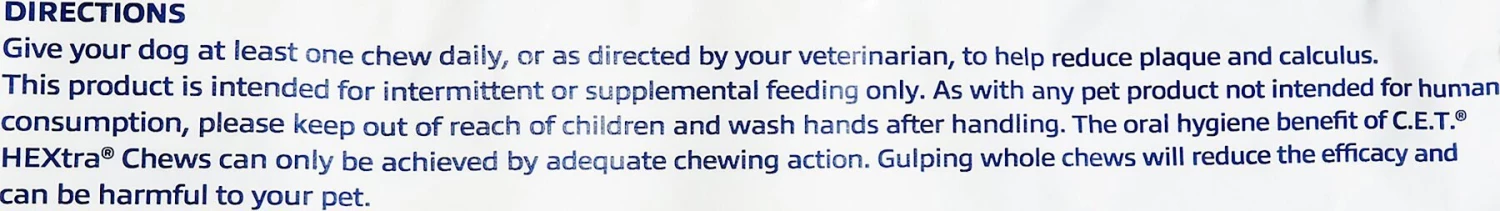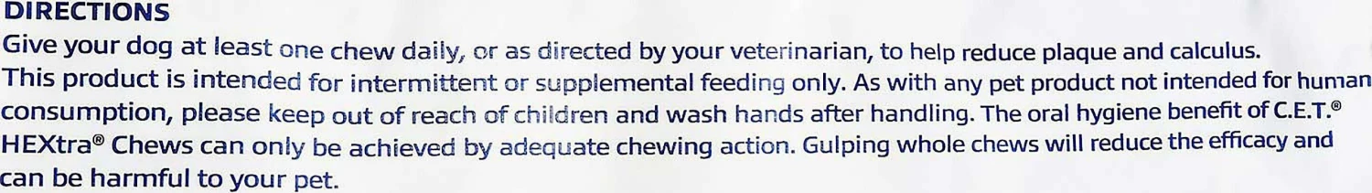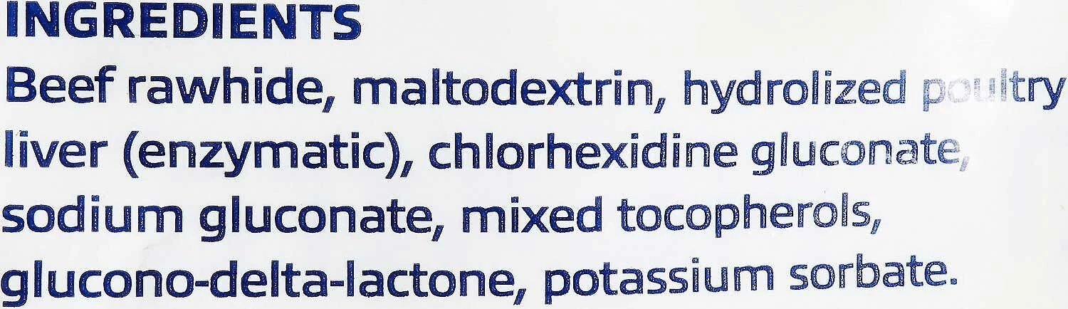 C.E.T. Hextra Premium Chews Are Coated with A Patented 10% (W/W) Solution of Chlorhexidine Gluconate, Beefhide, Maltodextrin, Hydrolyzed Poultry Liver (Enzymatic), Tetrasodium Pyrophosphate, Salt, Lecithin, Sodium Gluconate, Potassium Sorbate, Gluconodeltalactone, Mineral Oil, Mixed Tocopherols, Rosemary Extract.