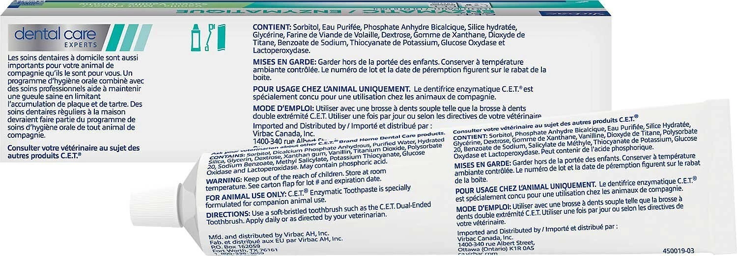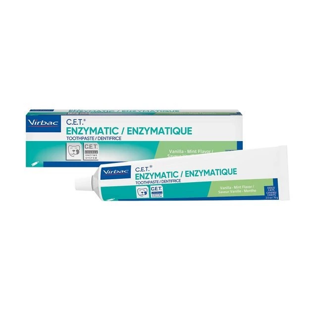 - Comes with a Virbac C.E.T. Pet Toothbrush of a various color and a 70-gram tube of Virbac C.E.T. Enzymatic Dog & Cat Vanilla-Mint Flavor Toothpaste.